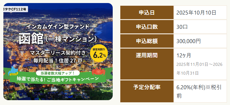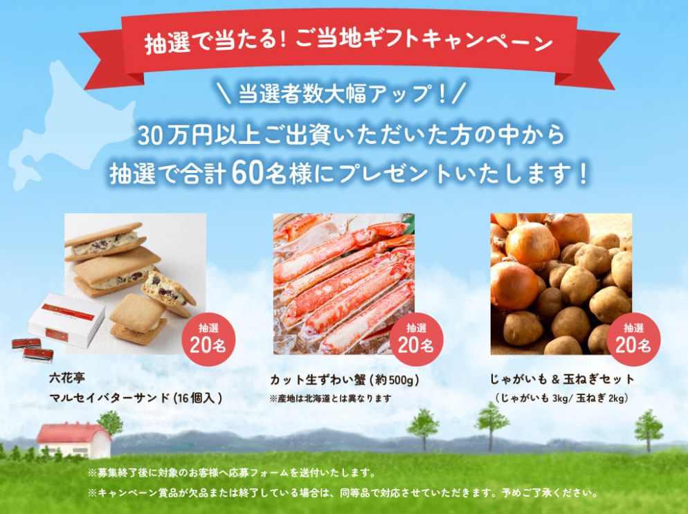 今回出資したCF112号は30万円以上の出資で抽選で60名にご当地ギフトプレゼント!
