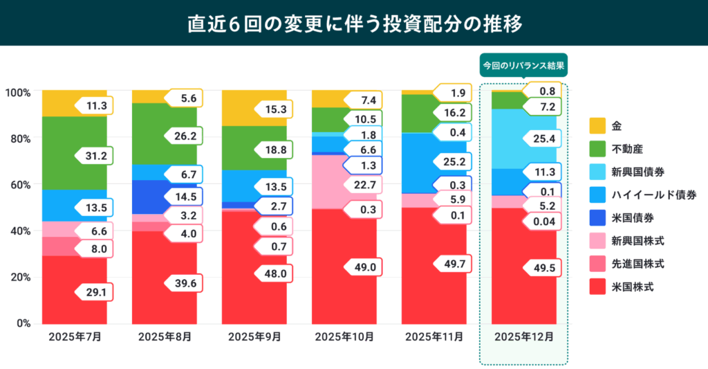 現在のポートフォリオは米国株式49%、新興国債権24%、ハイイールド債11%と続いています。