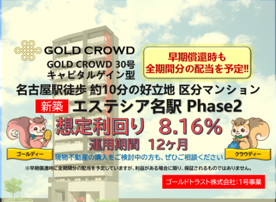 参加見送り案件1つ目はCAPIMA「さつまいも生産六次産業化支援ファンド」。 こちらはサツマイモ農家さんを支援するもので、特別優待として30万円以上の出資者には干し芋がいただける案件です。 干し芋いいんですよね…0歳・3歳のおやつに与えると、歯ごたえがあるので食べるのに時間がかかってしばしの静寂を手に入れることができますので、おススメです! 干し芋は魅力的とはいえ、投資判断は別物です。 利回りや特典は魅力的ですので、資金に余裕がある場合には、リスクを理解したうえで小ロットで参加するのも作戦かとは思いますが、チキンなすずめは降りることにします(;^_^A 参加見送り案件2つ目はゴールドクラウド「エステシア名駅Phase2」。 キャピタル型案件、想定利回り高め、早期償還時にも全期間配当を予定ということで、条件は悪くないと思います。 以前腹黒すずめの意見を記事にしましたが(↓過去記事)、キャピタル型案件に投資する際はリスクに見合った還元をしようとする事業者か、そうでないかを見極めた方がいいと思います。 今回はリスクに見合った条件だとは思うのですが、対象物件が少し引っ掛かりました。 25平米×4区分ということで、ネットで調べた限りではいわゆる一人暮らし用ワンルームくらいの部屋を4室入手したという感じ。名古屋に住んでいたことがあるのですが、名駅前に一人暮らしの需要ってあるのかが疑問でして…。 東京なら、富豪が上京する大学生の子息のためにワンルームを買い上げてしまう(賃貸じゃなくて購入)することがあるのかなぁと思うのですが、名古屋ではあまり聞かないですね。 名駅まではJR・名鉄・地下鉄・市バスが十分に発達しており、賃貸価格も高くないので「名駅に近い」がそこまで需要があるのか自信が持てません。 あくまで不動産素人の意見ですので、ただの勘ですが今回は見送ろうかと思います。パスする案件①:CAPIMA