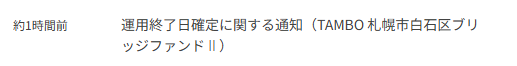 「キャピタル型だから控えめに30万くらいで抽選参加しようかな~」と思っていたところ、同社で運用中の札幌市白石区ブリッジファンドⅡから早期償還のお知らせが来ました。