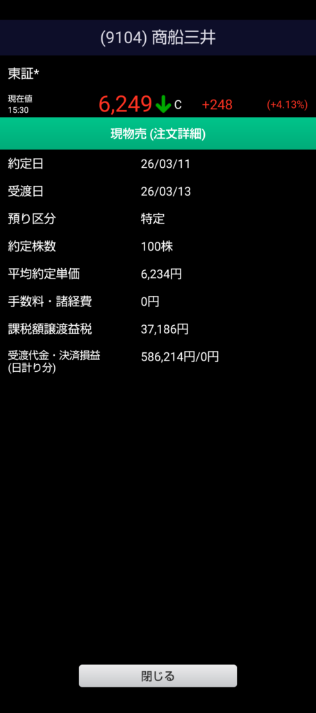 2025年12月1日100株4,404円で購入し、2026年3月11日PTSにて6,234円で売却。